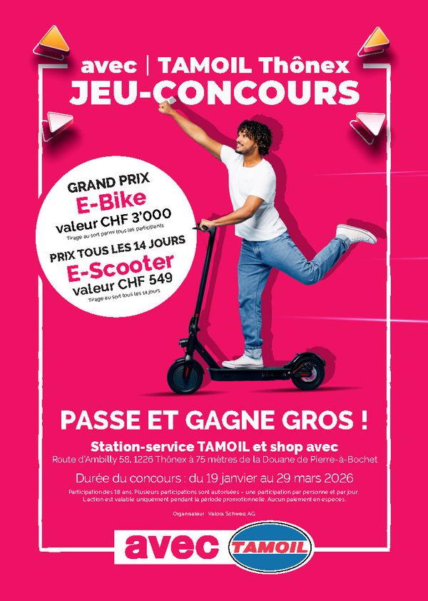 La station-service TAMOIL Thônex et le shop avec vous invitent à participer à un grand jeu-concours qui se déroule du 19 janvier au 29 mars 2026, à la station située Route d’Ambilly 58 à Thônex, à deux pas de la douane de Pierre-à-Bochet.